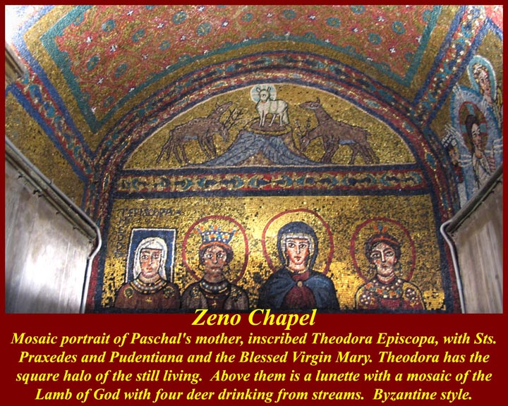 Paschal also decorated a funerary chapel for his mother, who was still alive when the chapel was decorated (square halo again). Her image is labeled Theodora Episcopa, and that detail has been claimed by some as evidence that there were women priests in the Roman Catholic Church at least into the 9th century.
