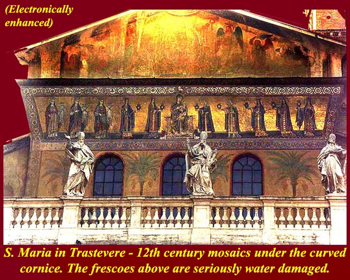 Santa Maria in Trastevere facade mosaics. On the front of the church above the Renaissance balcony the the 12th century mosaic shows Mary and ten virgins carrying lamps (the "Wise and Foolish Virgins" in Matthew 25:1-13). The mosaic is mounted on an overhanging curved cornice surface which has helped to keep it out of the weather. The fresco above the mosaic is almost completely washed away. In fact, it's just a dim mass of pastel colors. In this image the fresco is electronically enhanced to show whatever detail is available, so the colors are very artificial. For an un-enhanced view, see http://commondatastorage.googleapis.com/static.panoramio.com/photos/original/2256917.jpg.)
