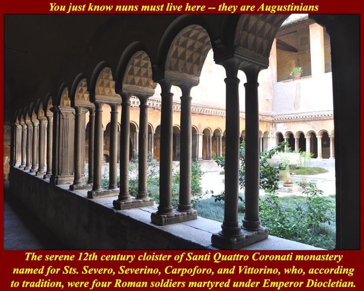 Ss. Quattro Coronati Church on the street that runs between the Colosseum and St. John Lateran has an papal chapel dedicated to Sylvester, the pope who was said to have converted and baptized Constantine. In the chapel, as we have seen, is a 1246 fresco cycle showing incidents in Sylvester's life, including a bit of 13th century papal propaganda: Constantine is shown kneeling before Sylvester and giving him the famous "Donation". The fresco was painted at a time when Innocent IV was trying to exert authority over Frederick II Hohenstaufen, the Holy Roman Emperor. In fact, however, the Donation was a forgery. (Another legendary incident shown in the fresco cycle is Sylvester curing Constantine of leprosy.) There is also no evidence that Constantine and Sylvester ever met.