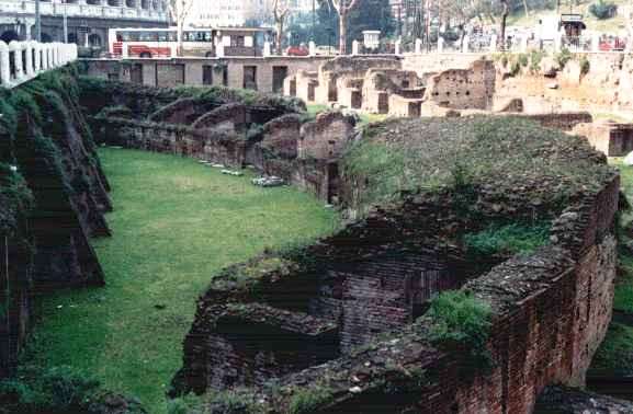 The Ludus Magnus, the largest of the gladiatorial schools in Rome, was built by the emperor Domitian (81-96 AD), whose father and brother, Vespasian and Titus had built the Colosseuin. It is located in the valley between the Esquiline and the Caelian Hills. The visible ruins of the monument belong to a second building stage attributed to the emperor Traijan (98-117), when the level of the school was raised by about 1 1Ú2 m.