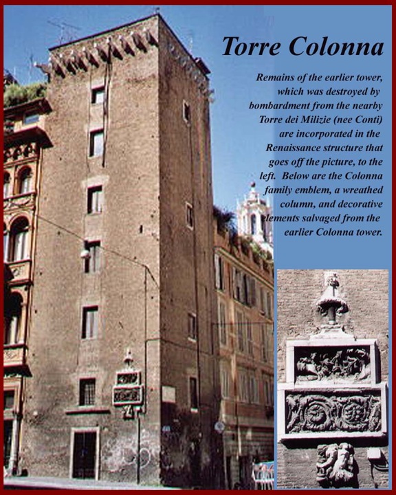 The big Roman medieval families either took over existing ancient buildings and fortified them or they built their own fortified towers. Ownership/occupation of the ancient Theater of Marcellus, built by Augustus, passed through several families and finally ended up in the hands of the Orsini. The Conti family apparently had two massive towers at opposite ends of the Ancient Roman imperial forums, the massive Torre Millizie and the Torre Conti. The Colonna tower near the Torre Millizie was an attempt by the Colonna to "tower over" the Conti. Torre Colonna was knocked down in a battle with the Conti, but was rebuilt, and the Colonna still live in their nearby Palazzo. (a) Fortifications in the Theater of Marcellus, (b) Conti fortifications -- Torre Millizie, (c) Colonna fortifications -- Torre Colonna(a)