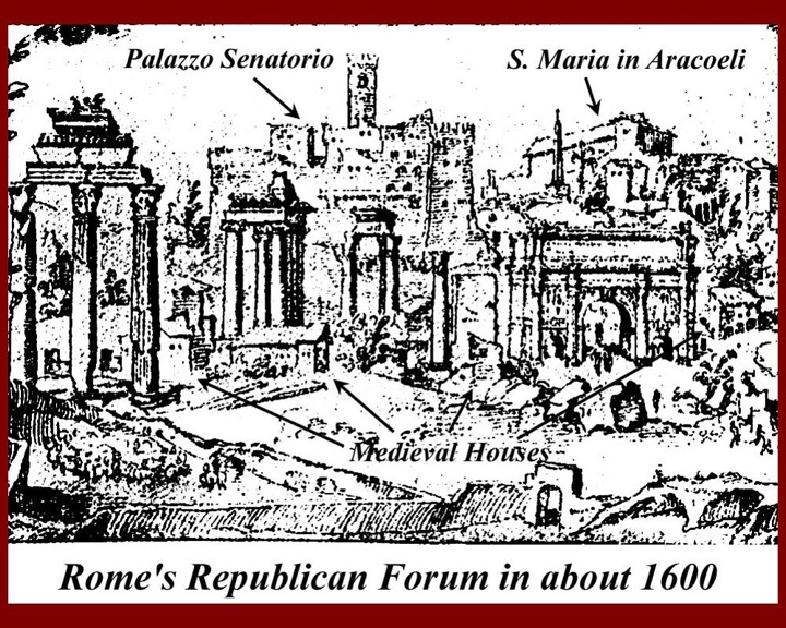 Medieval Houses in the Republican Forum. The Roman republican forum became a pestilential quagmire after the eastern Roman emperors stole the metal clamps that held together the cloaca maxima, the sewer that had drained the area since the times of the Etruscan kings that had ruled Rome even before it became a republic. By the time of the renaissance the streams leading down from Rome's hills had silted up the forum to the point that it could be used as a campo vaccino or cow pasture. A few medieval structures were built along one edge, and the Arch of Septimius Severus, only the top half of which was exposed, became a fortified home of a local capo. The forum escaped the attentions of renaissance builders except for several churches build around its fringes and except for its use as a mine for ancient Roman marble -- the base of the ancient bronze statue of Marcus Aurelius that Michelangelo put up in the center of Piazza Campidoglio was once part of the steps leading up to the temple of Castor and Pollux. The forum, in fact, wasn't really excavated until the 19th century. Carlo Fea began his work around the Severus arch in 1803, and, later in the century, Rudolfo Lanciani formed a core of distinguished late nineteenth-century scholars of the Roman forum including Henri Jordan, Christian Huelsen, Samuel Ball Platner, and Thomas Ashby. Excavations in the republican forum continued into the 20th century, and in the adjacent imperial forums excavations are still under way.
