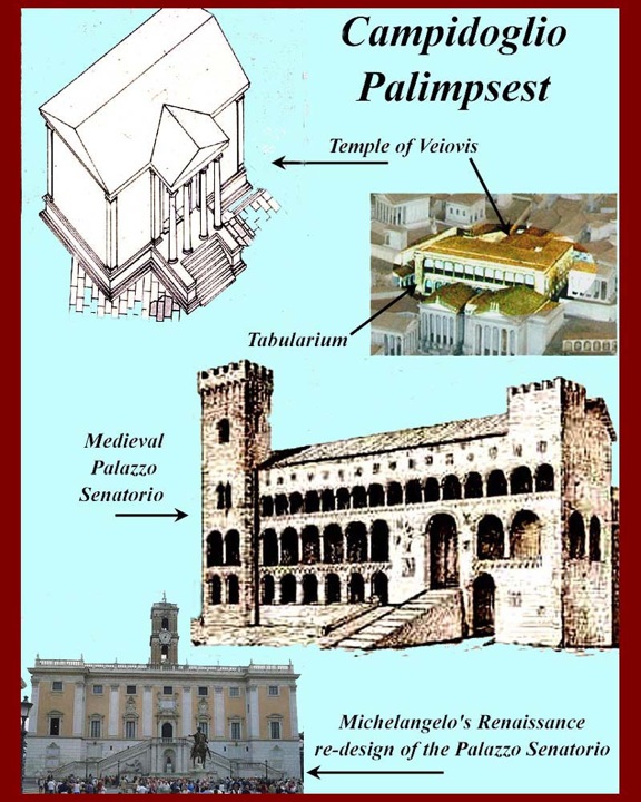 Rome's Capitoline hill, Campidoglio in Italian, is an architectural palimpsest. A pre-Roman temple of Veiovis is overlaid with the ancient Roman Tabularium (archives) and with a medieval fortress-house which was remodeled by Michelangelo. Michelangelo's building at the back of his Piazza Campidoglio (with the bell tower) now houses the ceremonial rooms of Rome's municipal government. His other two buildings on the Piazza house the Capitoline Museums. The layers under the municipal building are accessible to visitors. Entry is through the museums.