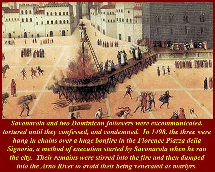 Girolamo Savonarola was a Dominican priest who preached against the "vanities" of the Renaissance. He was famous for (although he probably did not invent) the "bonfire of the vanities". Born in 1452, he was the leader of Florence from 1494 until his execution in 1498. He was known for his book burning, destruction of what he considered immoral art, and hostility to the Renaissance. He vehemently preached against the moral corruption of much of the clergy at the time, and his main opponent was Rodrigo Borgia, when he was Pope Alexander VI, from 1492 to 1503. Because book-burning became associated with the Nazis in the 20th century, Savonarola sometimes has been characterized as a right-wing religious extremist. In fact, he was not that but rather he was a left-wing religious extremist. The penalty for crossing Savonarola, when he was in charge, was a particularly gruesome death suspended in chains from a cross over a raging bonfire. Savonarola and his two best henchmen eventually were killed the same way after they lost popular support (and after French support evaporated.) He was excommunicated by the Pope, tortured until he confessed, condemned, and turned over to the civil authorities for execution. A contemporary artist recorded the event -- the Bonfire of Savonarola.