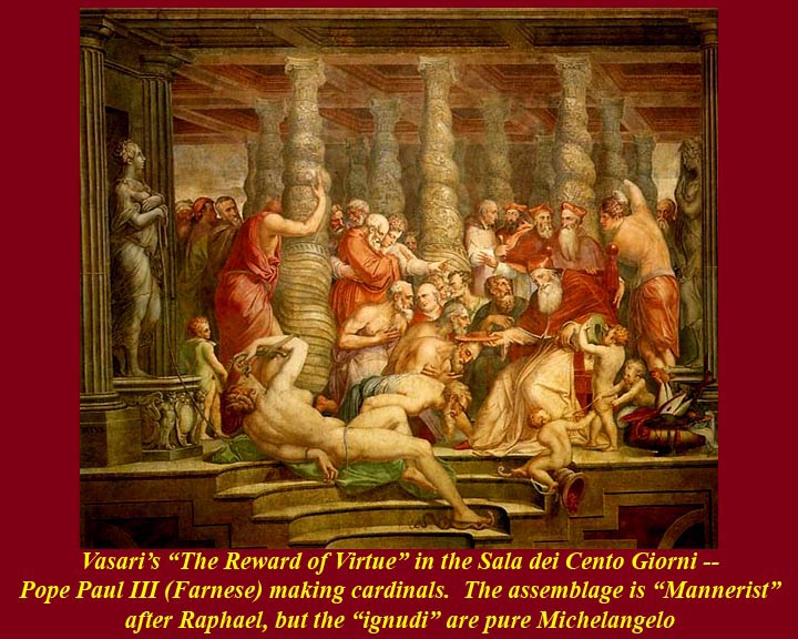 The style of Vasari's frescoes in the Sala dei Cento Giorni is called "mannerist", meaning in the manner of Raphael. It refers to the grouping of figures in active groups and can best be seen in the Stanze (= rooms) di Raffaello that Raphael frescoed in the new Vatican Papal apartments for commissioned by Pope Julius II della Rovere -- Julius refused to live in the same rooms that had been occupied by Alexander VI Borgia.