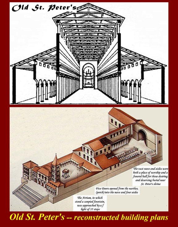 By the time of the Renaissance, Old St. Peter's was crumbling and ready to collapse. As can be seen from the images, the old basilica was shaped like a T and it had a large courtyard (of the catechumens) in which candidate members of the church could attend service and ceremonies. The second image is by Marten Jacobszoon Heemskerk van Veen whose bio is at http://en.wikipedia.org/wiki/Marten_Jacobszoon_Heemskerk_van_Veen.