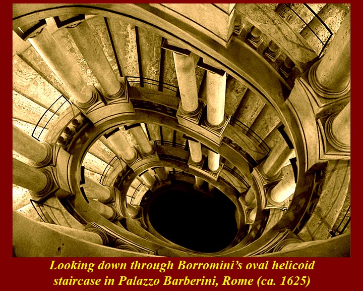 Although Borromini was less successful than Bernini at getting large architectural commissions in Rome, his work has always been considered more innovative than Bernini's, and, of course, that was also part of his problem. After he and Bernini parted ways (they had worked together on early commissions), Bernini apparently made it a point to advertise the oddness of some of Boromini's architecture. But some of Borromini's work set patterns that were followed elsewhere in Rome, in Italy, and further afield -- like the helicoid spiral staircase he designed early in his career in the Palazzo Barberini. Barberini's staircase in the other wing of the Palazzo is just single straight flights of stairs around an air shaft. Barberini's air shaft now houses the elevators of the Barberini Museum in the Palazzo, while the Borromini helix is preserved in pristine condition as one of the main attractions of the Palazzo. For more information on Borromini, see http://en.wikipedia.org/wiki/Francesco_Borromini and, for the competition between Borromini and Bernini, see http://roma.andreapollett.com/S2/roma-c5.htm.